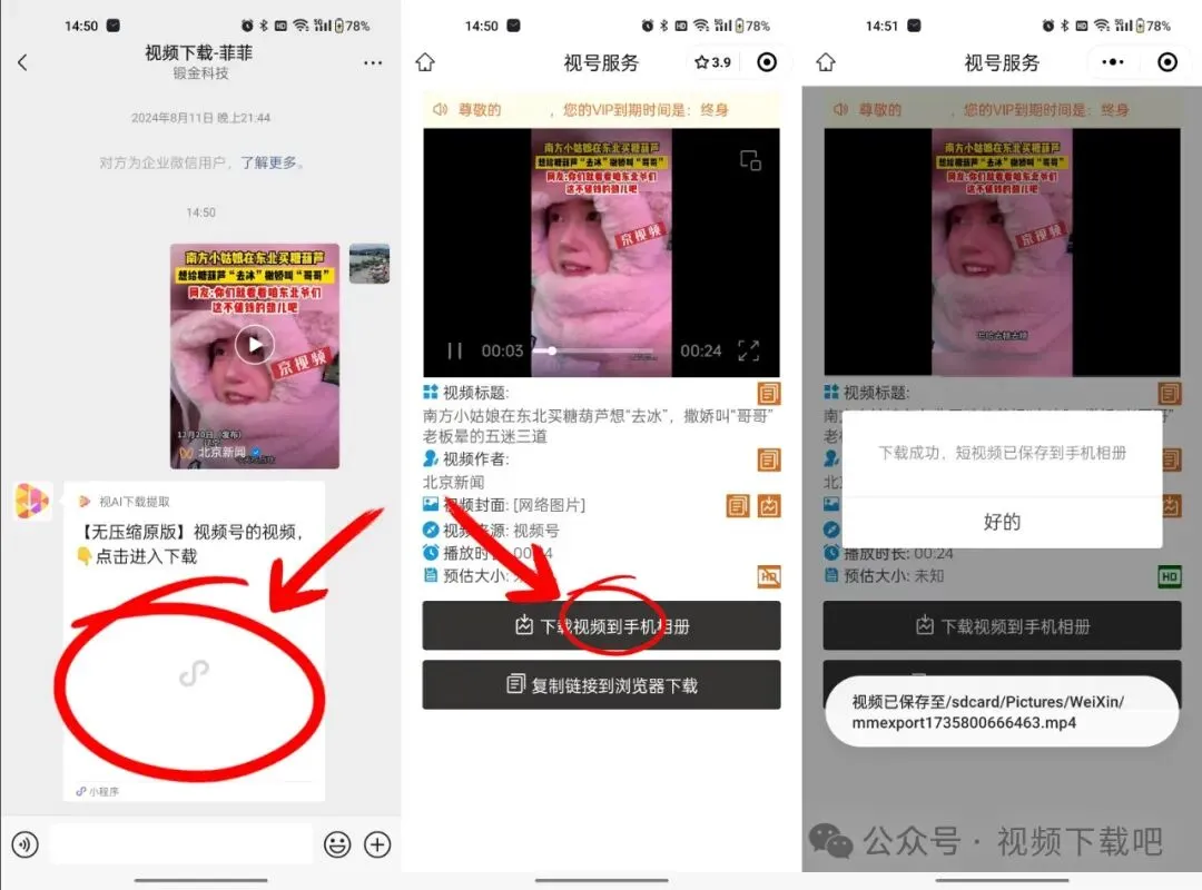 分享完成后,视频号助手会立马给你返回一个下载链接。你点击这个链接,就能看到保存按钮,直接点击保存,视频就下载到你的手机相册里了。完全没有任何平台水印,清清爽爽的。