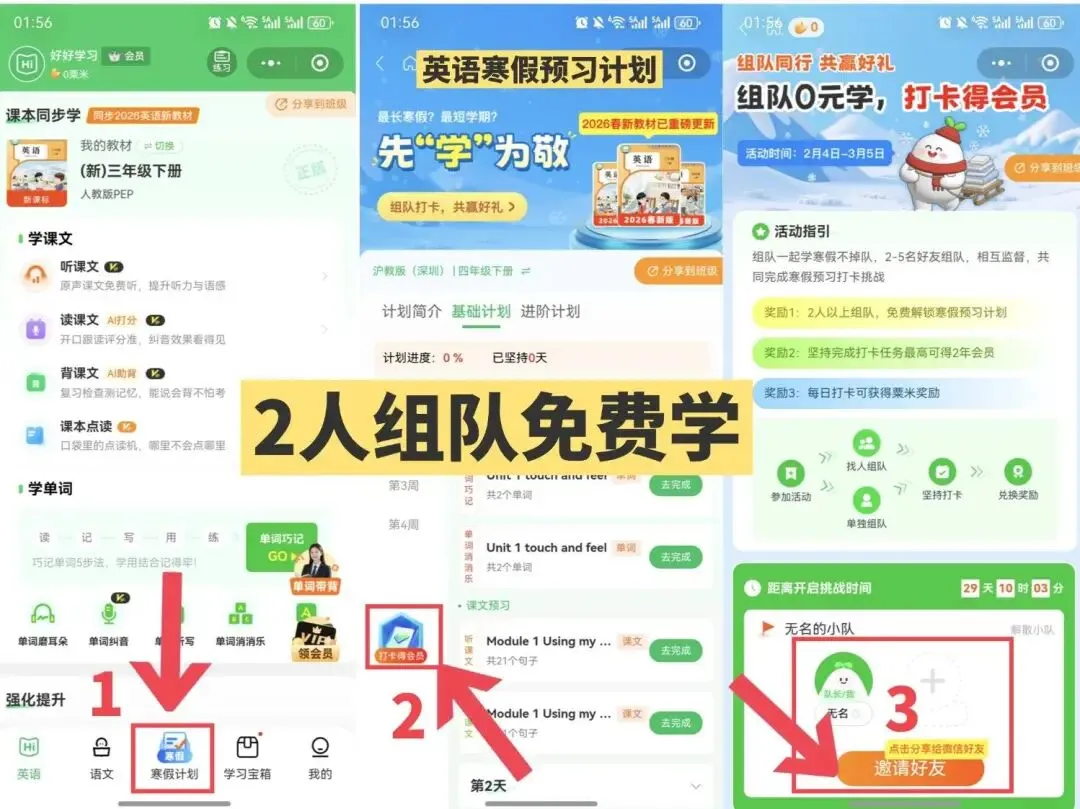 现在孩子邀请好友或同学,2人组队即可免费解锁【寒假预习计划】全部内容,只要组队打卡21天!即可获得英语朗读宝会员!组队人越多,奖励越多,最高可得2年年卡!