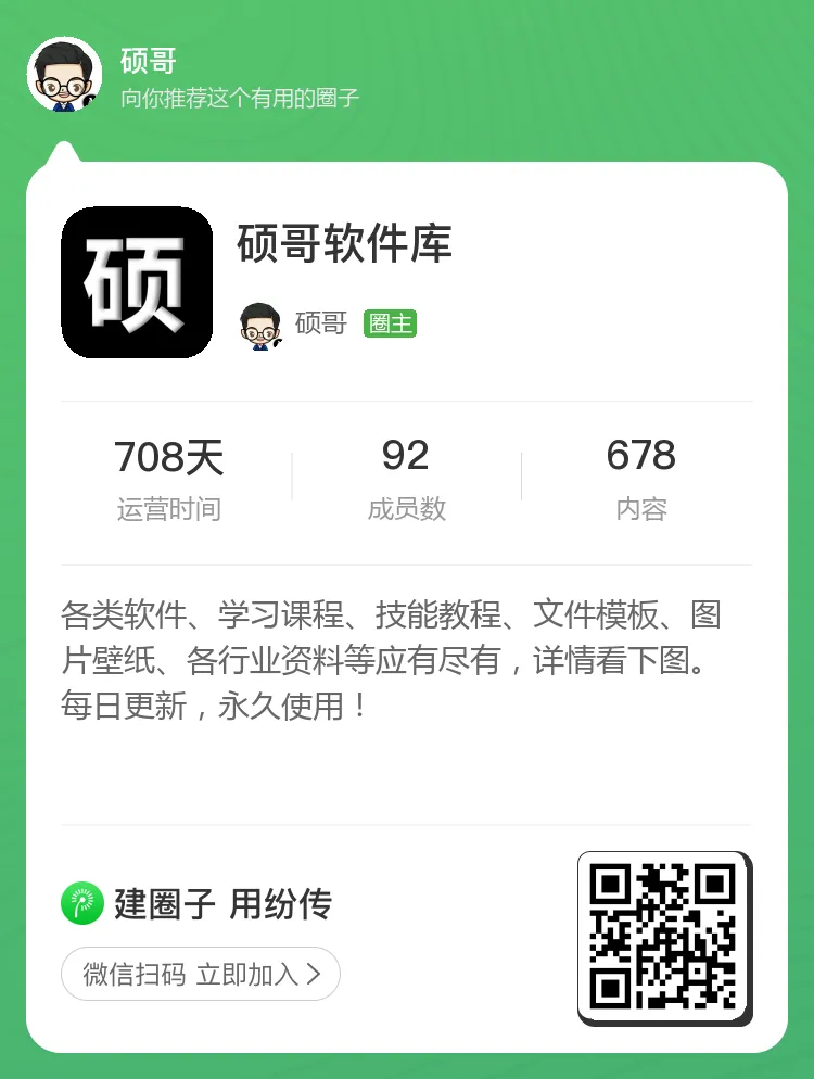 硕哥建了个圈子,里面分享各种考研考编等考试资料、付费课程、技能教程、文件模板、精品软件、优质网站等资源,安卓、苹果、电脑三端黑科技软件,永久免费魔法工具,老司机福利!!加入硕哥的资源圈,直接一次性获取全部资源哦!长按下面的二维码赶紧加入吧!