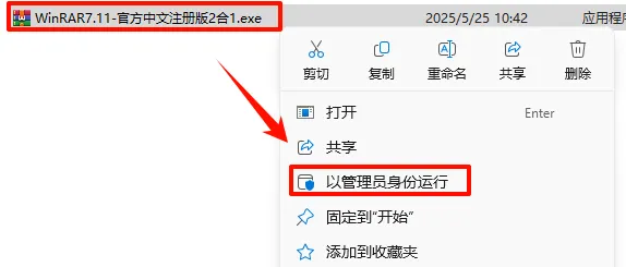 1.选中下载的压缩包,鼠标右键点击“WinRAR7.11-官方中文注册版2合1.exe”选择“以管理员身份运行”