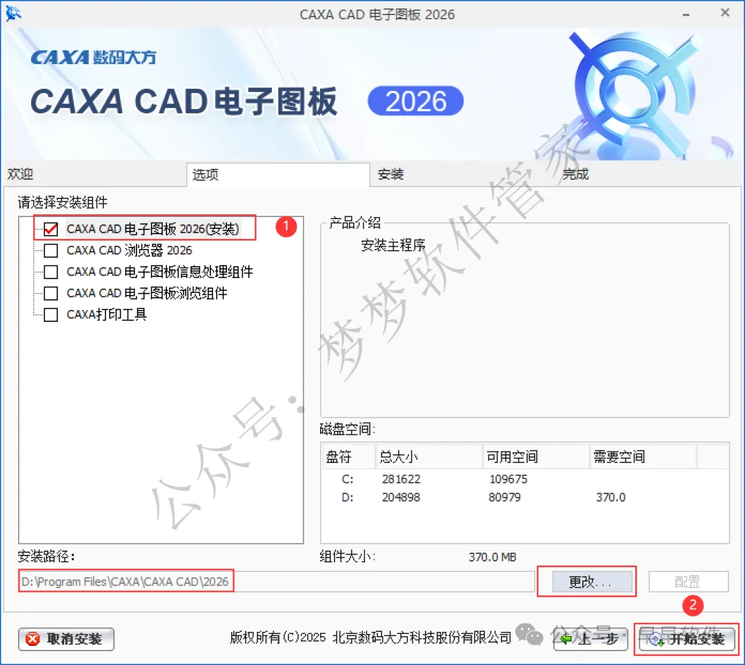 6、软件默认安装在C盘,可自定义更改软件安装位置,这里小编选择安装在D盘;选择需要安装的组件,再点击【开始安装】