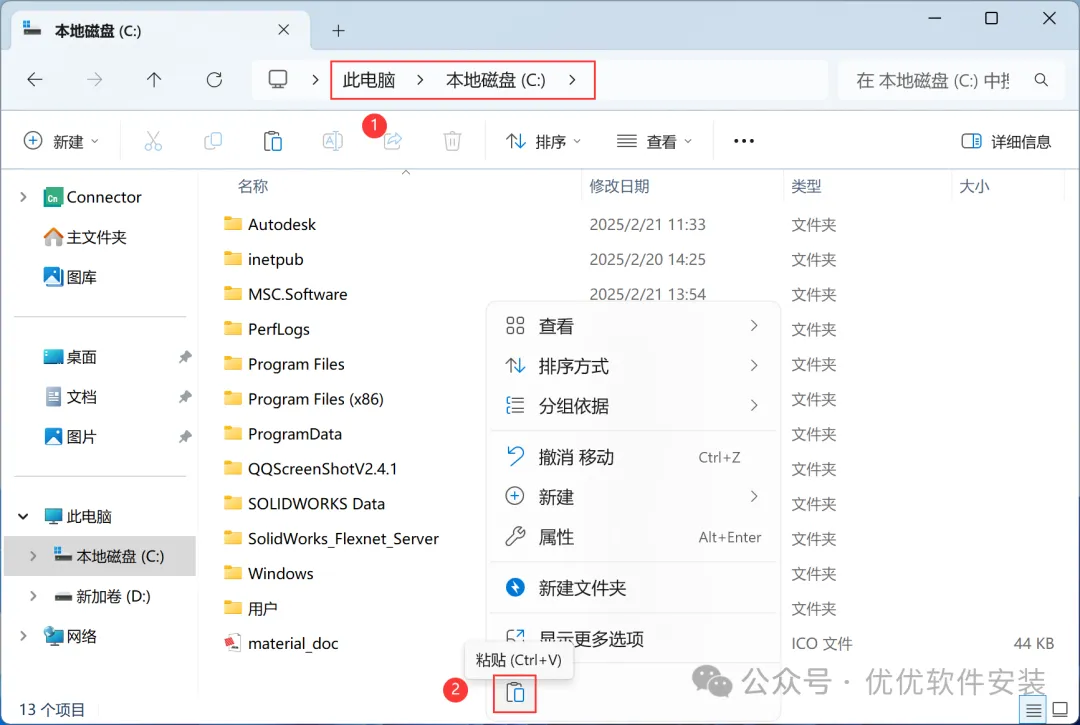 14、打开本地磁盘C,再右键文件夹的空白处,点击【粘贴按钮】