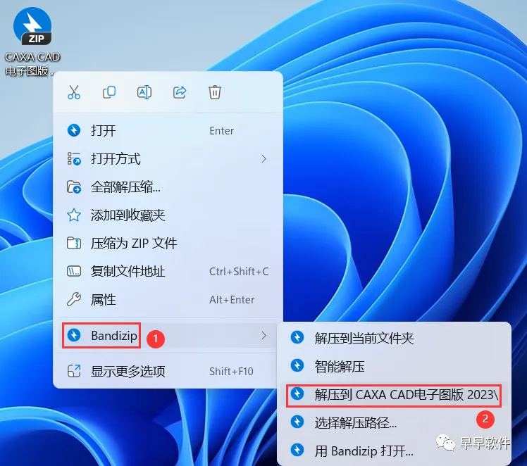 1、下载CAXA CAD电子图版 2023软件安装包到电脑上,右键选择【解压到CAXA CAD电子图版 2023\】