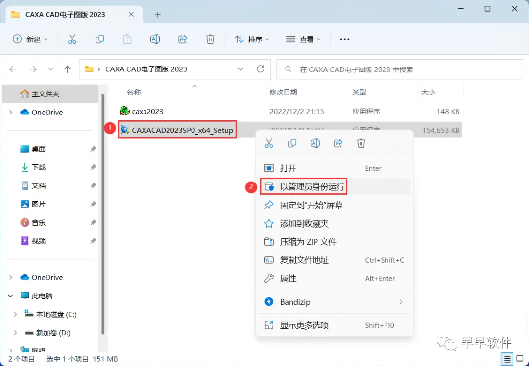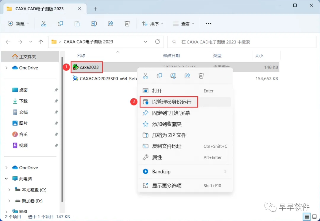 10、回到CAXA CAD电子图版 2023文件夹,找到【caxa2023】应用程序,右键选择【以管理员身份运行】它