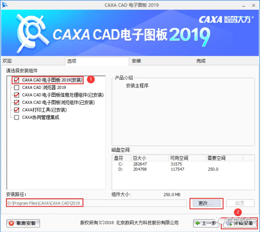 6、勾选需要安装的组件,软件默认安装在C盘,可自定义更改软件安装位置,这里小编选择安装在D盘;点击【开始安装】