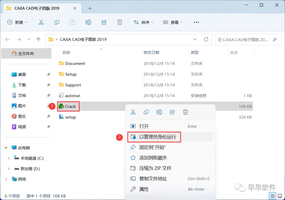 10、回到CAXA CAD电子图版 2019文件夹,找到【Crack】程序,右键选择【以管理员身份运行】它