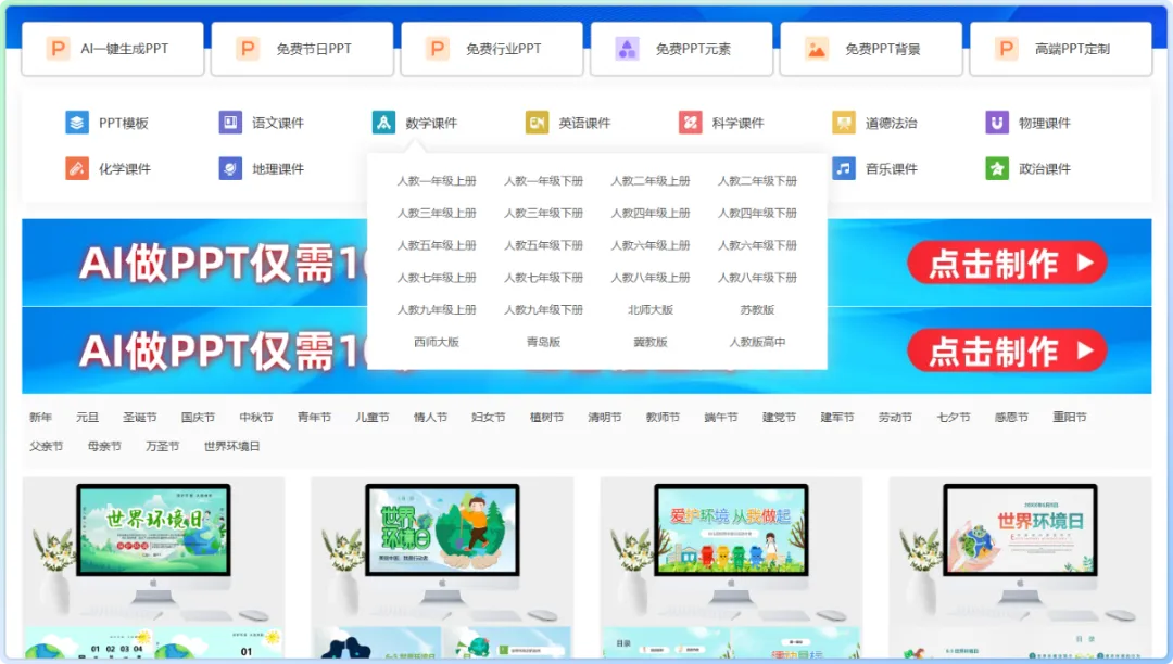 资源丰富且分类清晰,顶部导航栏与模块化布局清晰划分PPT模板、教学课件两大核心板块,模板涵盖商务汇报、论文答辩、节日庆典等多场景。