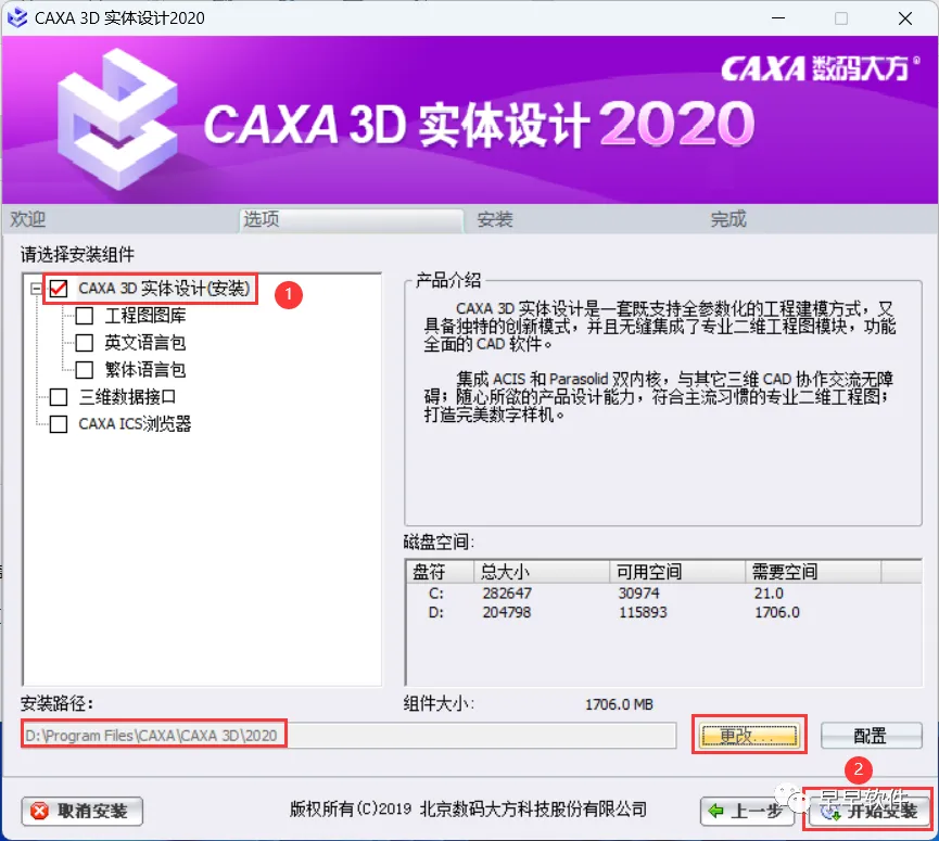 6、勾选需要安装的组件,软件默认安装在C盘,可自定义更改软件安装位置,这里小编选择安装在D盘;点击【开始安装】