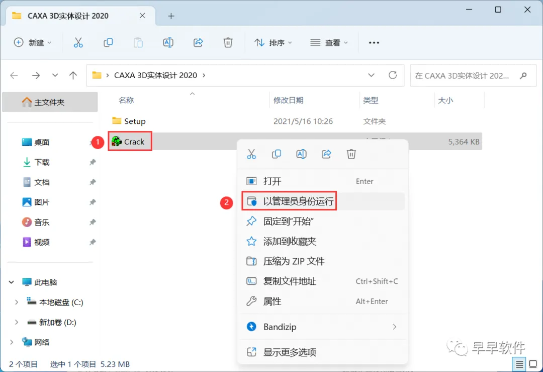 10、回到CAXA 3D实体设计 2020文件夹,找到【Crack】程序,右键选择【以管理员身份运行】它