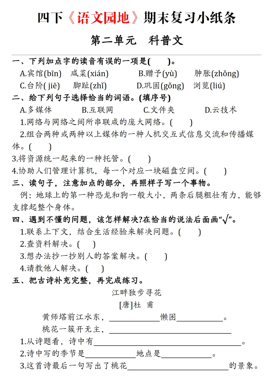 【免费下载】四年级(下)语文 期末语文园地练习单,PDF电子版,可打印