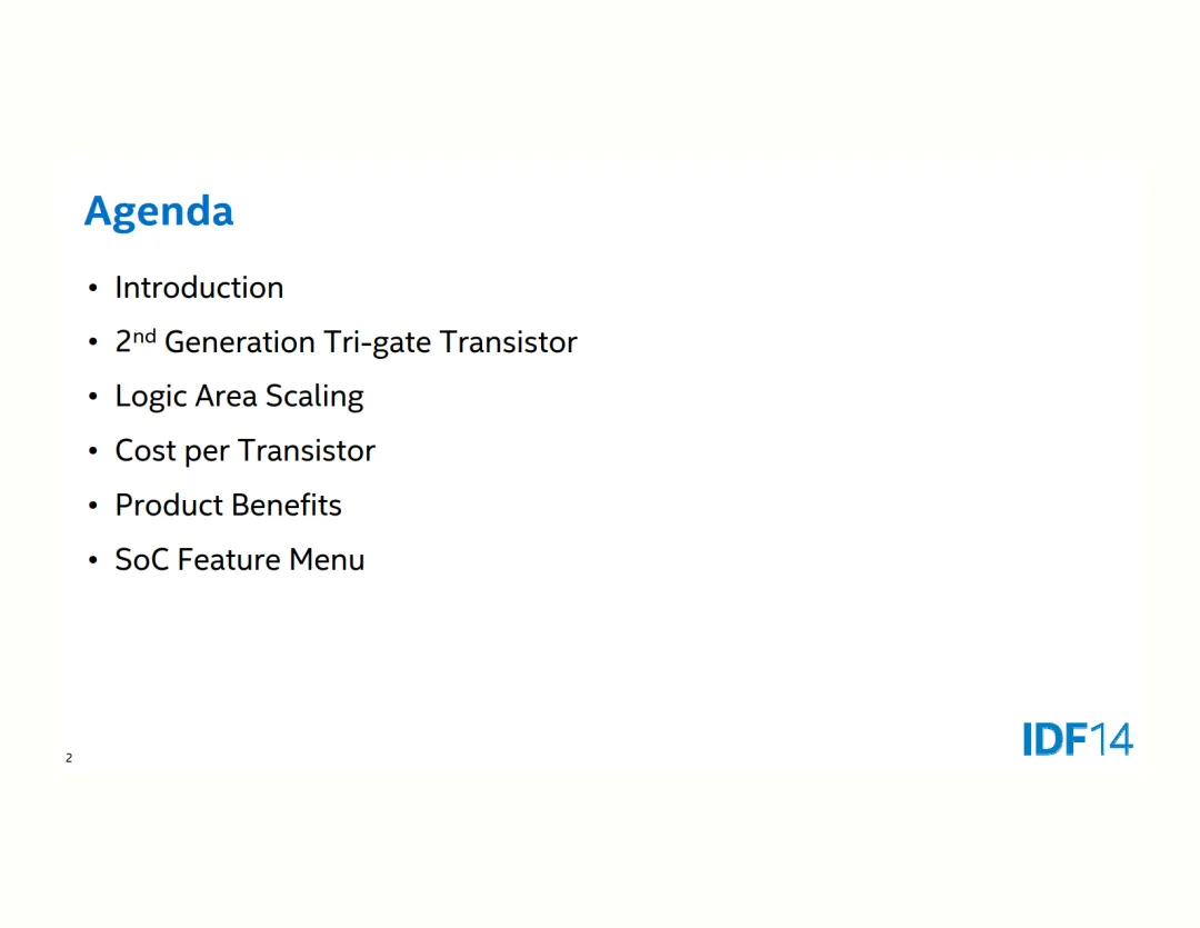 文档以“开启新视野”为主题,由英特尔资深院士Mark Bohr领衔讲解,核心围绕**第二代三栅极晶体管(FinFET)**展开,系统呈现14纳米工艺在逻辑面积缩放、单晶体管成本、产品优势及SoC功能菜单等维度的突破。彼时,英特尔已凭借22纳米三栅极晶体管出货超5亿颗芯片,而14纳米作为全球首个进入量产的技术,以42纳米鳍间距、70纳米栅极间距、52纳米互连间距的“真14纳米”维度缩放,实现了超越常规的密度提升——SRAM单元面积较22纳米缩小至0.0588μm²(0.54倍),逻辑面积每代缩放约0.53倍,且通过自对准双图案等先进工艺,让14纳米的密度比同期竞品“20/16/14纳米”技术高约1.3倍,甚至与竞品未来“10纳米”密度相当却早3年落地。