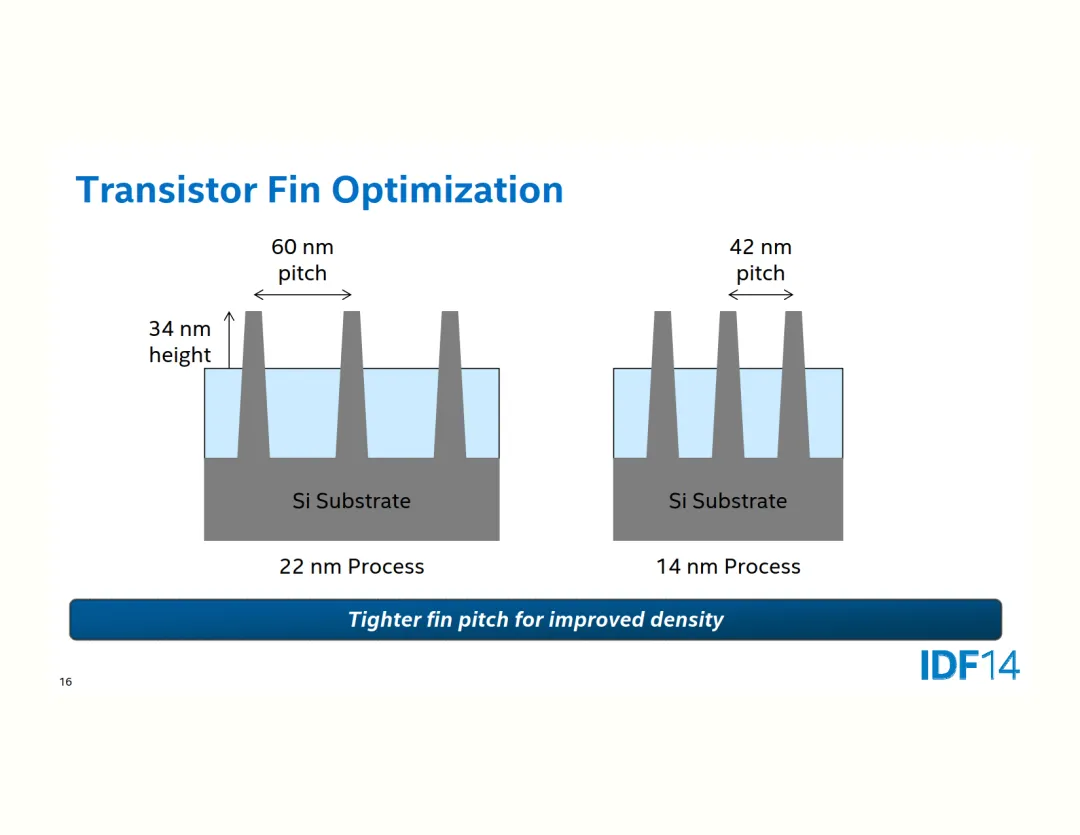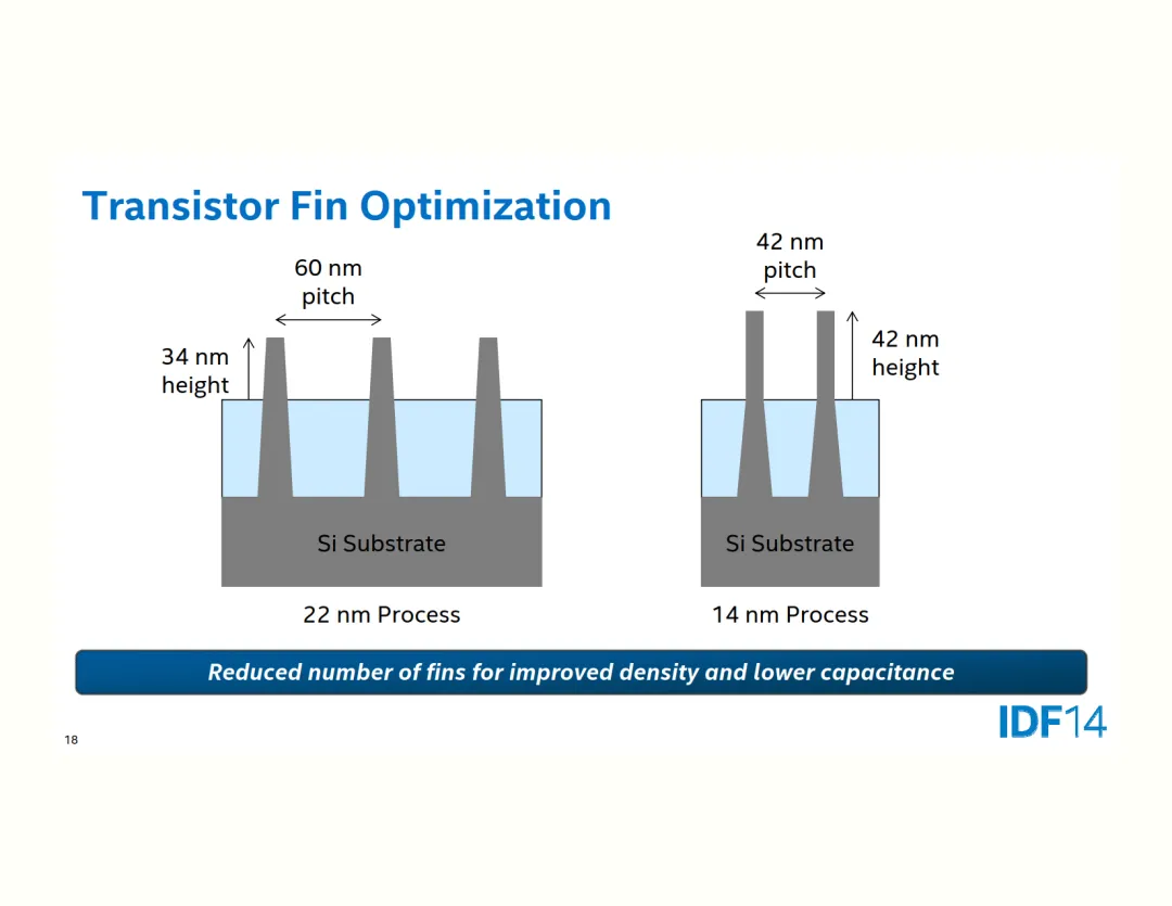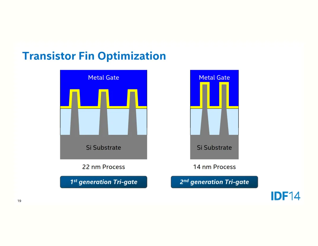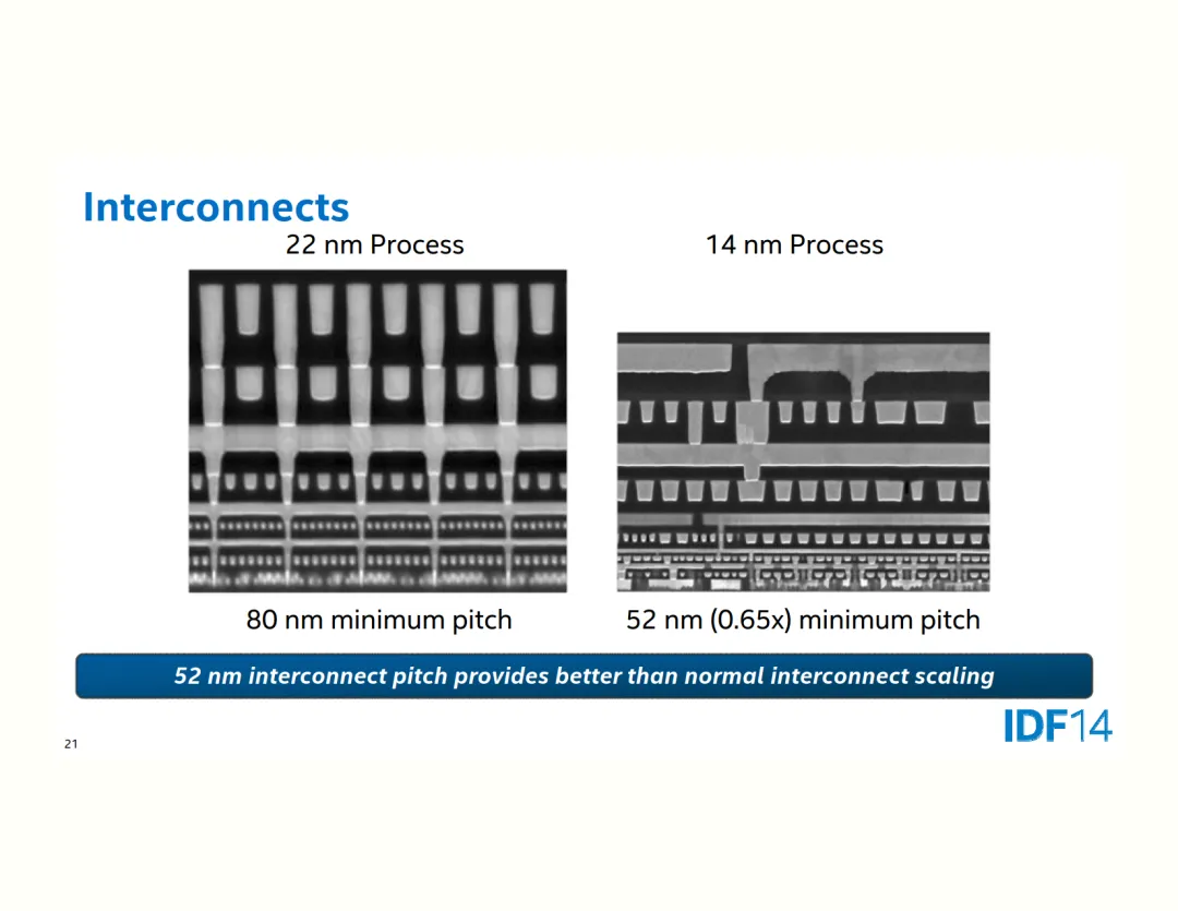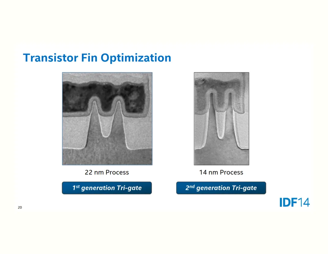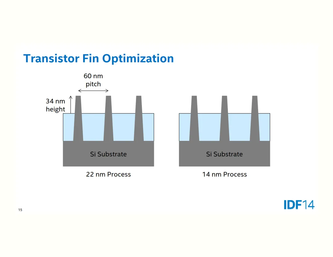 性能与功耗的平衡是14纳米的另一亮点:第二代三栅极晶体管优化了鳍的宽度(8nm)与高度,实现更高驱动电流与更低泄漏,支撑从服务器到移动始终在线电路的全场景产品需求;14纳米酷睿M处理器作为首款量产14纳米产品,集成13亿晶体管、82mm² die,以4.5W TDP实现无风扇设计,性能较前代提升超2倍(CPU快50%、图形快40%),电池续航翻倍,且达成“无冲突矿物”标准。成本层面,尽管晶圆因掩模步骤增加推高成本,但14纳米通过更优面积缩放维持了单晶体管成本的持续下降,延续摩尔定律的经济性优势。