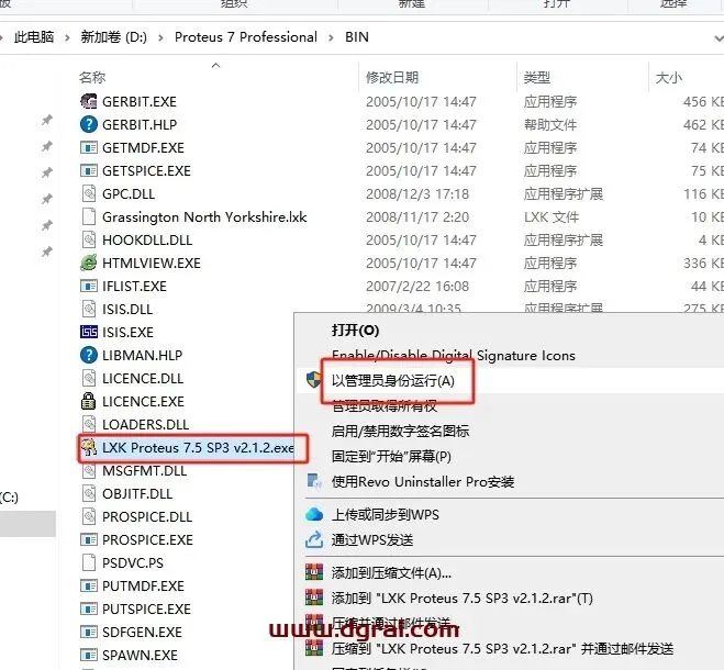选择LXK Proteus 7.5 SP3 v2.1.2.exe鼠标右键以管理员身份运行
