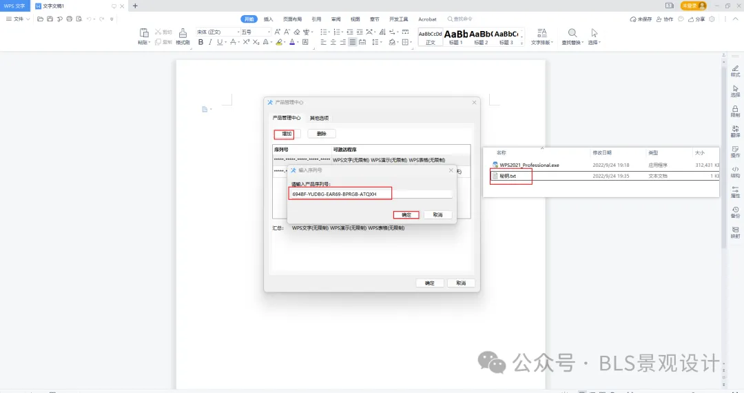 6.测试一个是否安装成功。本例演示【WPS文字】,双击打开【WPS文字】,找到框选内容7.单击【增加】,复制【秘钥.txt】内容,在【输入序列号】里面,粘贴刚刚复制的序列号,然后单击【确定】