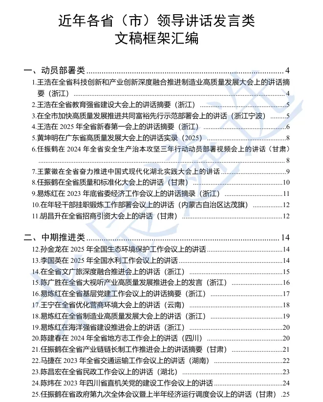 领导讲话稿不仅考验政策理论水平,更考验站位高度、逻辑架构与语言气场。《近年各省(市)领导讲话发言类文稿框架汇编64例》通过剖析真实的高层文稿框架,让你清晰看到优秀讲话稿的“骨骼”如何搭建,逐步掌握高层文稿的内在逻辑,实现写作能力的跨越式提升✨