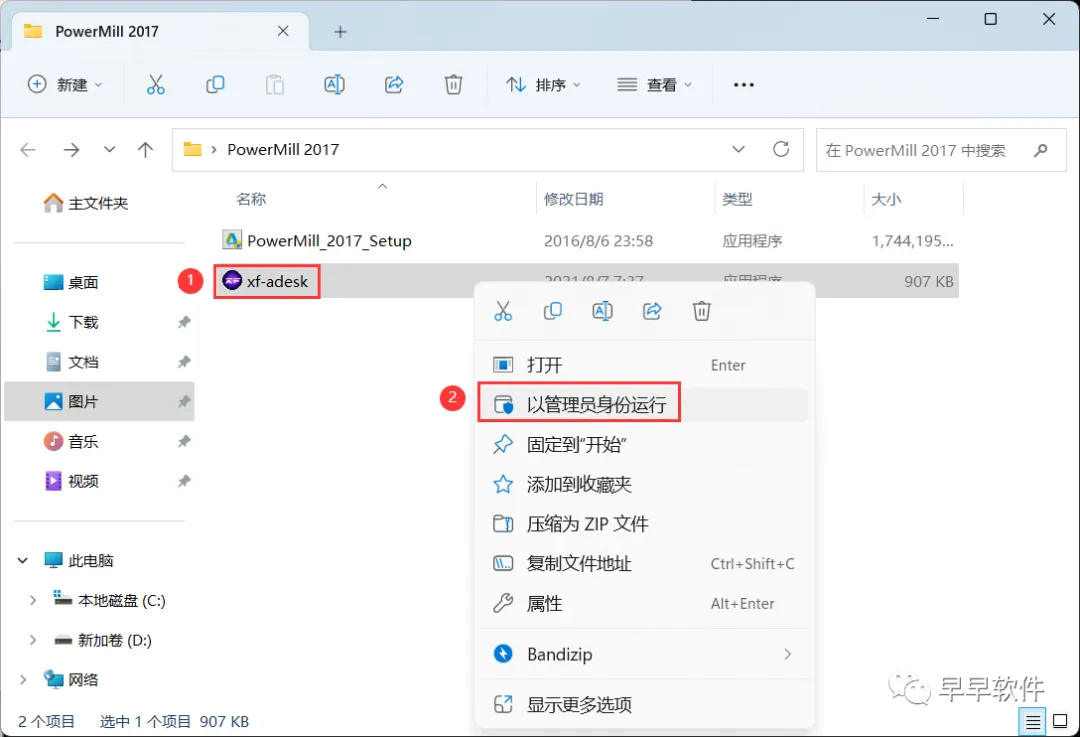 20、回到PowerMill 2017文件夹,找到【xf-adesk】程序,右键选择【以管理员身份运行】它