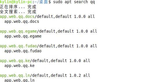 示例:想查询所有包含“qq”的软件包,输入:sudo apt search qq,终端会列出所有相关包名,找到自己需要的即可。