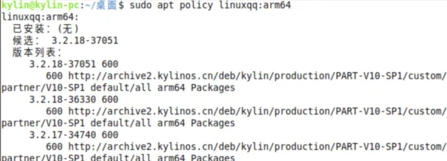 示例:查询arm64架构下“linuxqq”的可用版本,输入:sudo apt policy linuxqq:arm64,终端会显示该架构下“linuxqq”的所有可下载版本。