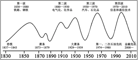 图片反映了1830—2010年世界经济发展的波动情况。从材料中提取信息,拟定一个论题,结合所学知识加以论述。(要求:论题明确,持论有据,表达清晰)