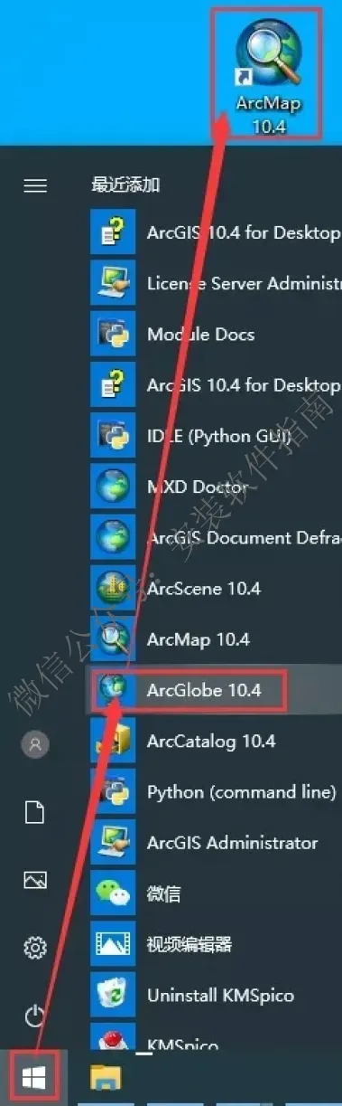 42.点开始菜单在最近添加内找到《ArcMap 10.4》软件程序,直接拖到桌面。