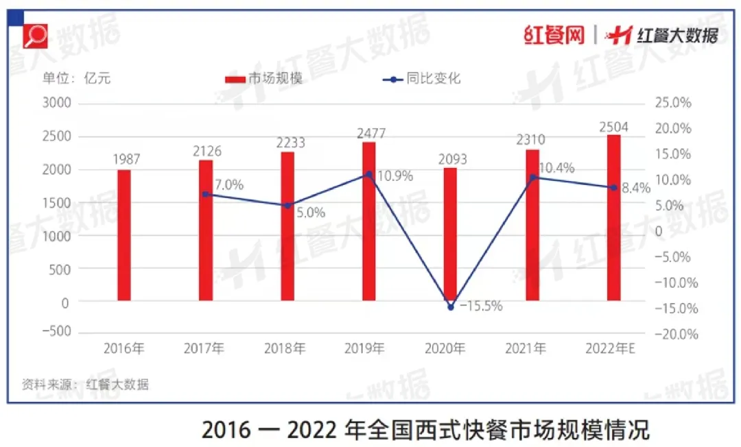 2022年,虽然疫情影响仍在,但由于西式快餐标准化程度高,适合外带外卖,受到的冲击相对较少,加上诸多头部品牌纷纷做出各项变革,业绩取得了一定的突破,门店规模也大幅提升,引领着西式快餐市场的进一步复苏。因此,2022年我国西式快餐的市场规模进一步上升,约为2500亿元。