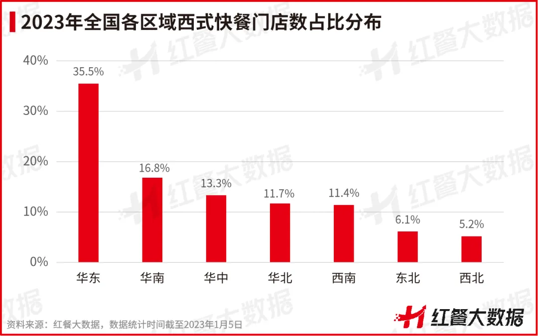 据红餐大数据,从西式快餐的区域分布来看,华东地区的西式快餐门店数最多,约占西式快餐总门店数的35.5%。华东地区外资企业数量庞大,对于西式餐饮接受度高,同时白领上班族数量众多,生活节奏快,从而对西式快餐的需求相对较大。