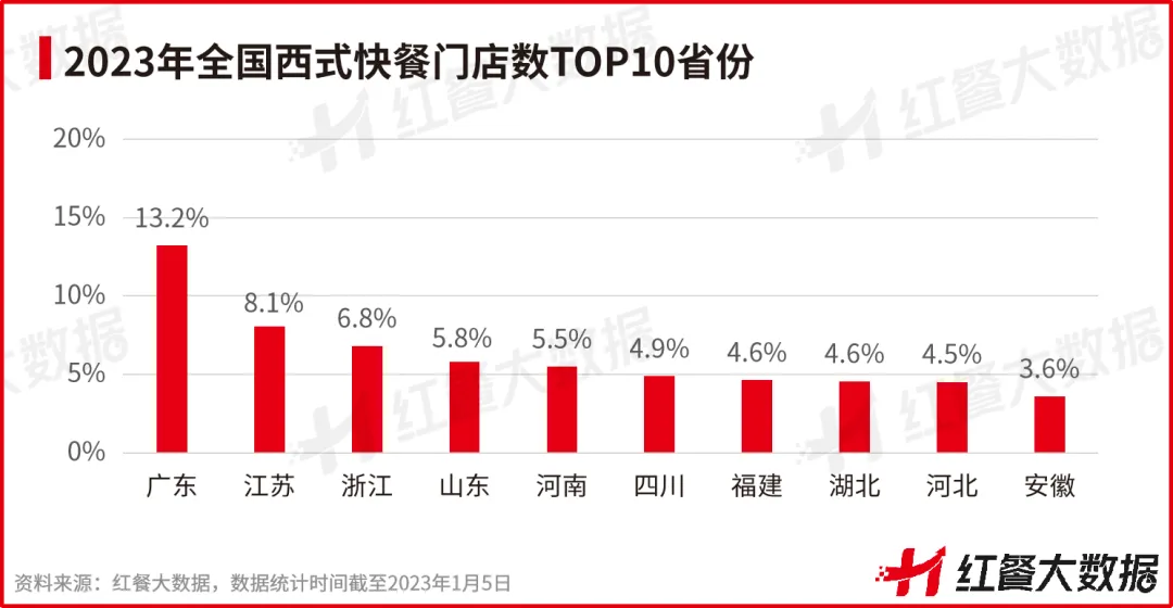 具体至省份,西式快餐门店数最多的5个省份依次是广东、江苏、浙江、山东和河南,门店数占比分别为13.2%、8.1%、6.8%、5.8%和5.5%。广东、江苏属沿海地区,对外开放程度相对较高,当地消费者对西餐文化的接纳程度也较高,西式快餐市场相对庞大。