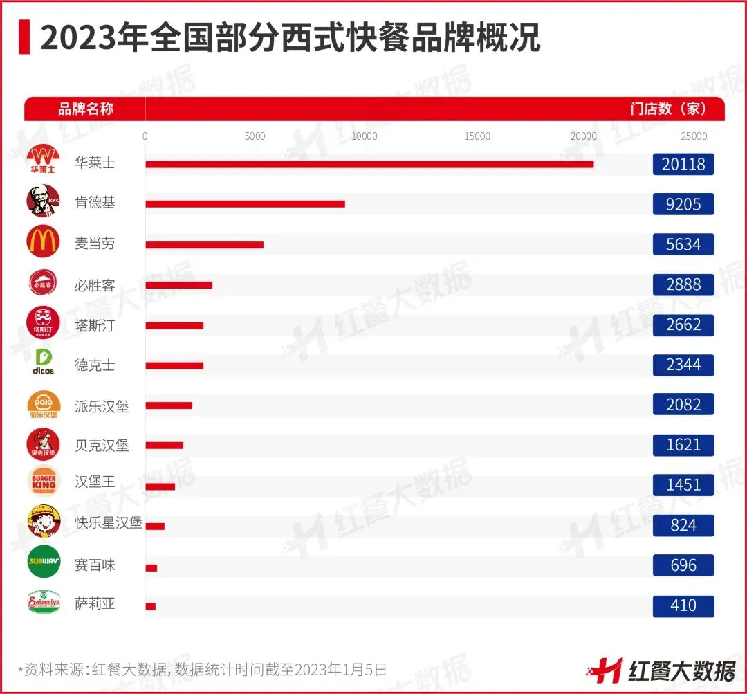 据红餐大数据,截至2023年1月5日,华莱士门店总数已超过了20000家;肯德基、麦当劳则分别以9200余家、5600余家门店跟随其后;必胜客、塔斯汀、德克士、派乐汉堡等品牌均已超过2000家门店。