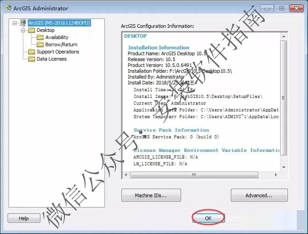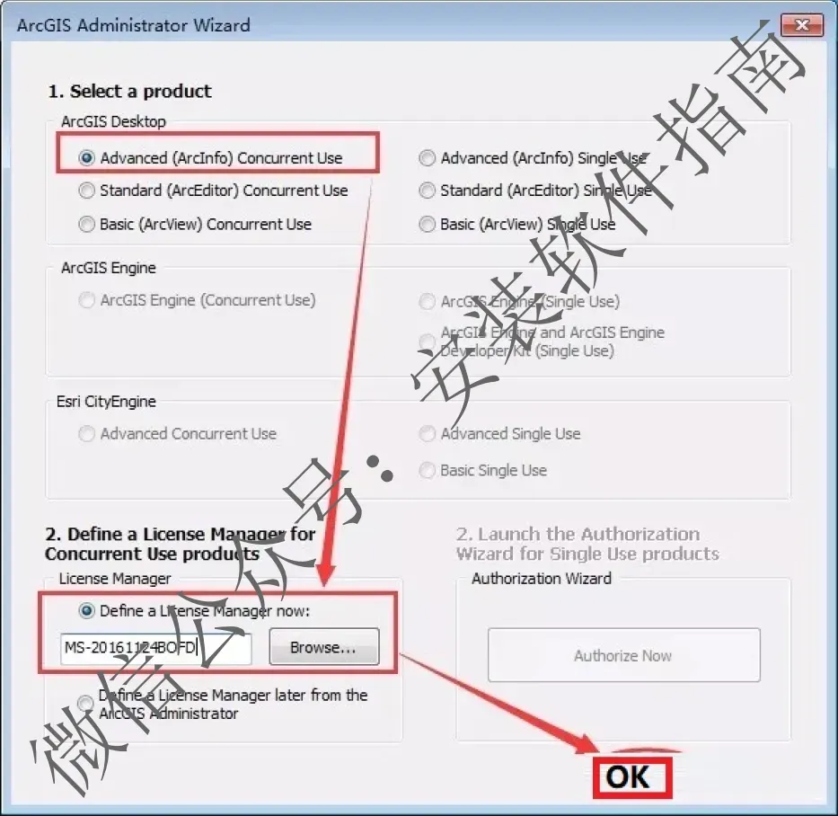 44.回到40步的那个框里,选择Advanced( ArcInfo)Concurrent Use,然后点Define a license Manager now,将刚才复制的计算机全名粘贴到下面的框里,然后点OK