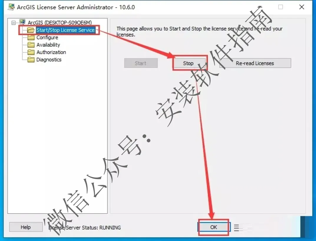 28.选择《Start/Stop License Service》点《Stop》,当《Stop》变成不可选中状态后,再点《OK》