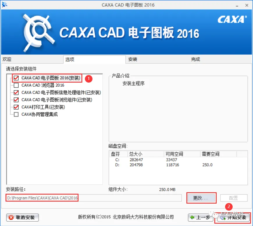 7、勾选需要安装的组件,软件默认安装在C盘,可自定义更改软件安装位置,这里小编选择安装在D盘;点击【开始安装】