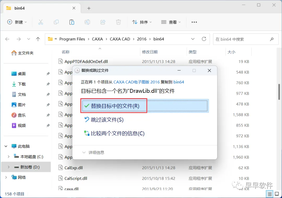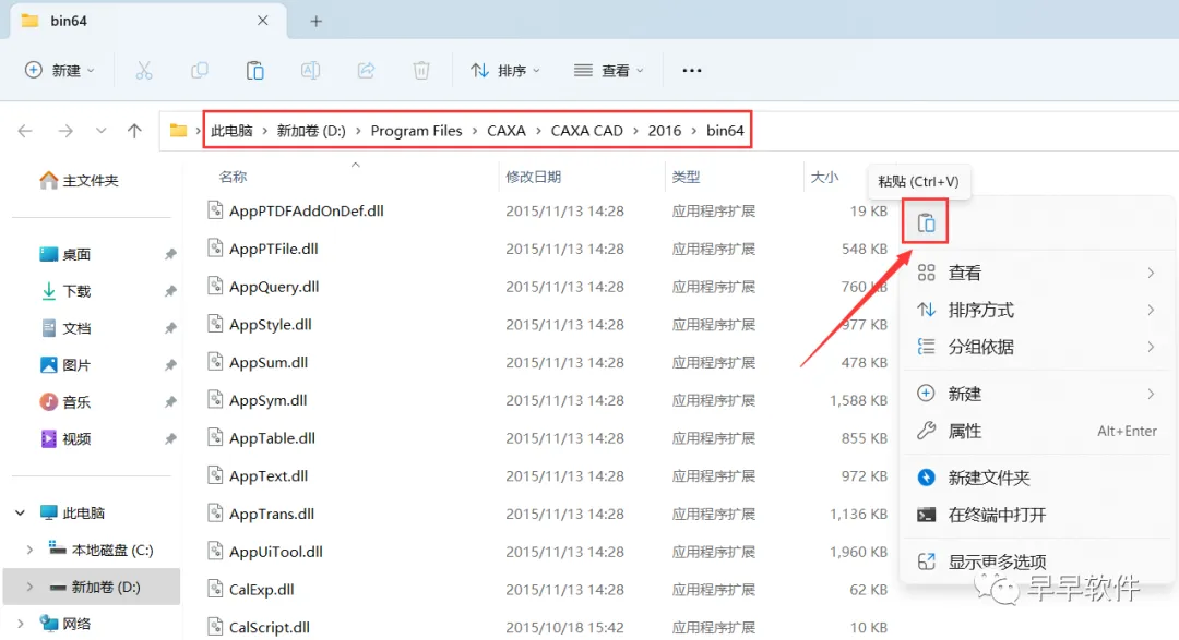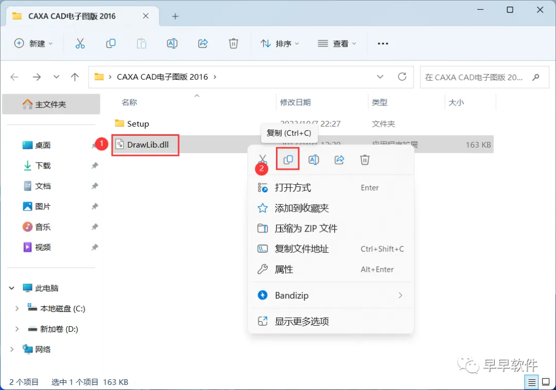 11、回到CAXA CAD电子图版 2016文件夹,找到【DrawLib.dll】文件,再右键点击【复制按钮】