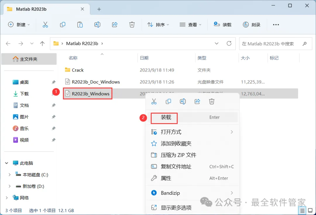 3、找到【R2023b_Windows】文件,右键点击【装载】