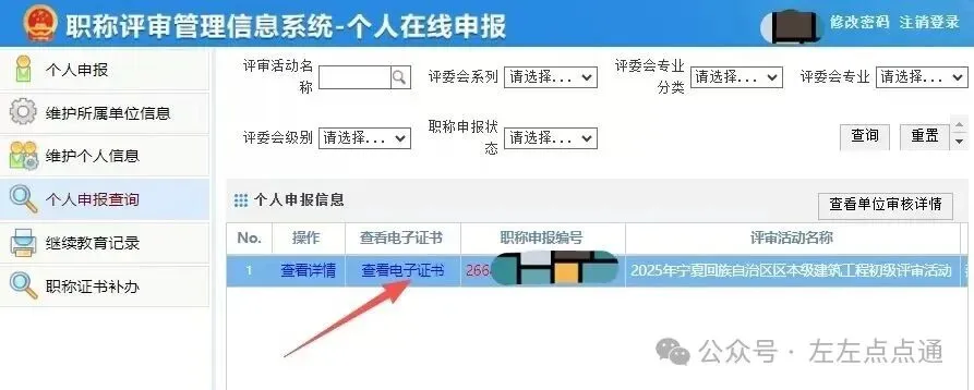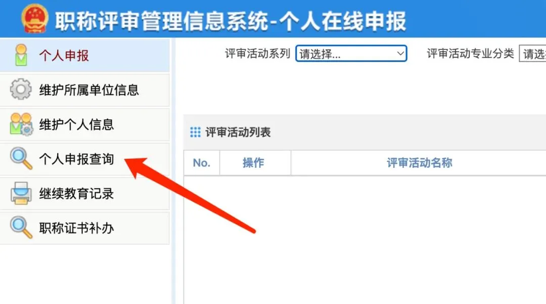 第三步:进入职称评审管理信息系统,点击左侧个人申报查询。