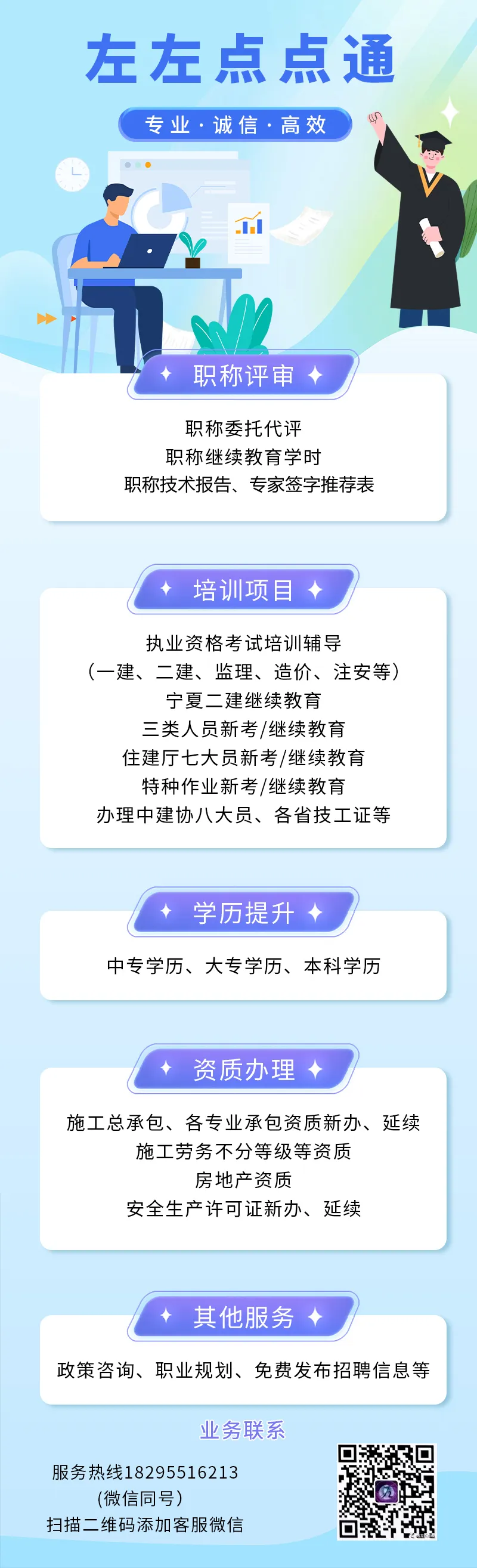 若需要咨询宁夏本地初级、中级、高级职称申报、技术总结报告、论文、职称学时等职称相关问题,直接扫描下方二维码或拨打电话联系详询。