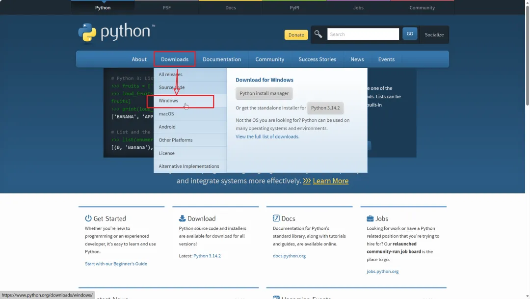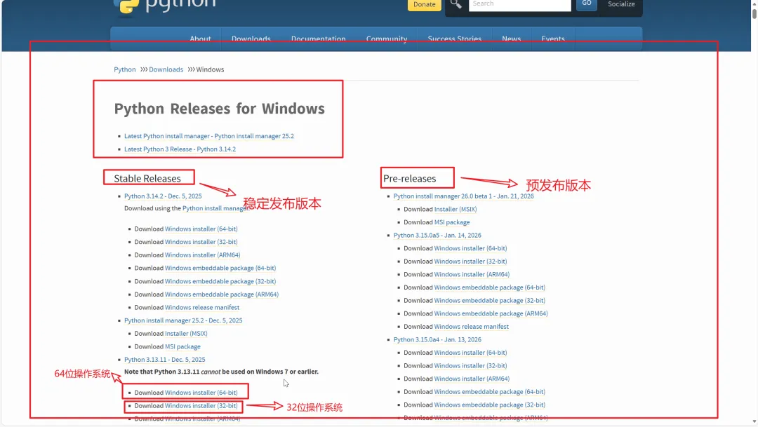 上面最新的版本是3.14.2版本,一般来说新版较之老版优化了一些内容且版本向下兼容,但是不建议下载最新版本,因为python在很多地方使用时没有更新到最新版本,向下兼容性并不好,但也不要太低版本的,很多不适用。点击Downloads,选择适合自己电脑系统的版本,我的电脑是Windows系统,就选择了Windows,点击后会跳转到另一个页面【Stable Releases】:稳定发布版本,是官方完成全面测试、修复已知 Bug 的成熟版本,运行稳定、风险低,无论入门学习还是机器视觉项目开发,都优先选这个版本;【Pre-releases】:预发布版本,属于测试阶段的 “体验版”,可能包含新功能但存在未修复的 Bug,稳定性差,小白或做实际项目(如机器视觉开发)千万别选,易出现代码报错、库兼容问题;【Windows embeddable package】:Windows 可嵌入程序包,通俗来说就是免安装的压缩包,解压就能用,仅适合将 Python 嵌入工业软件等特殊场景,小白入门不建议选,后续安装 OpenCV、YOLO 等机器视觉库会很麻烦;【Windows help file】:Windows 帮助文档,仅为纯技术描述的文字说明,没有实操教程,对刚学 Python 的小白几乎没有帮助,可直接无视。目前大家使用的市面上的电脑都是64位的,如果不知道自己是多少位操作系统,按一下Windows键找到“设置”→“系统”→“系统信息”可查看自己是多少位操作系统。二、Python安装
