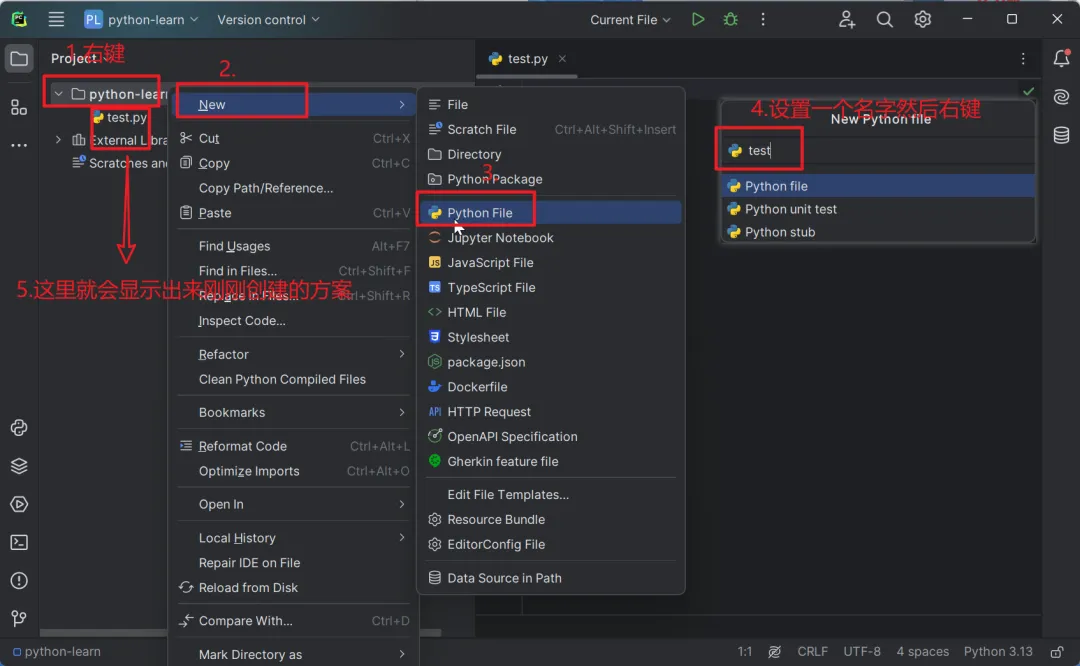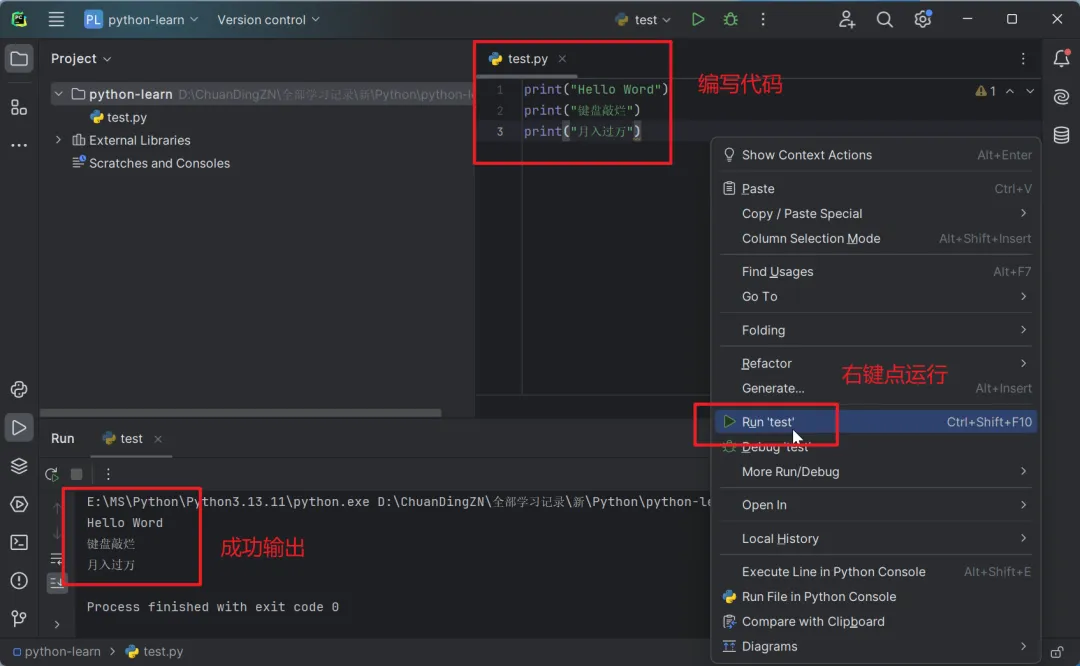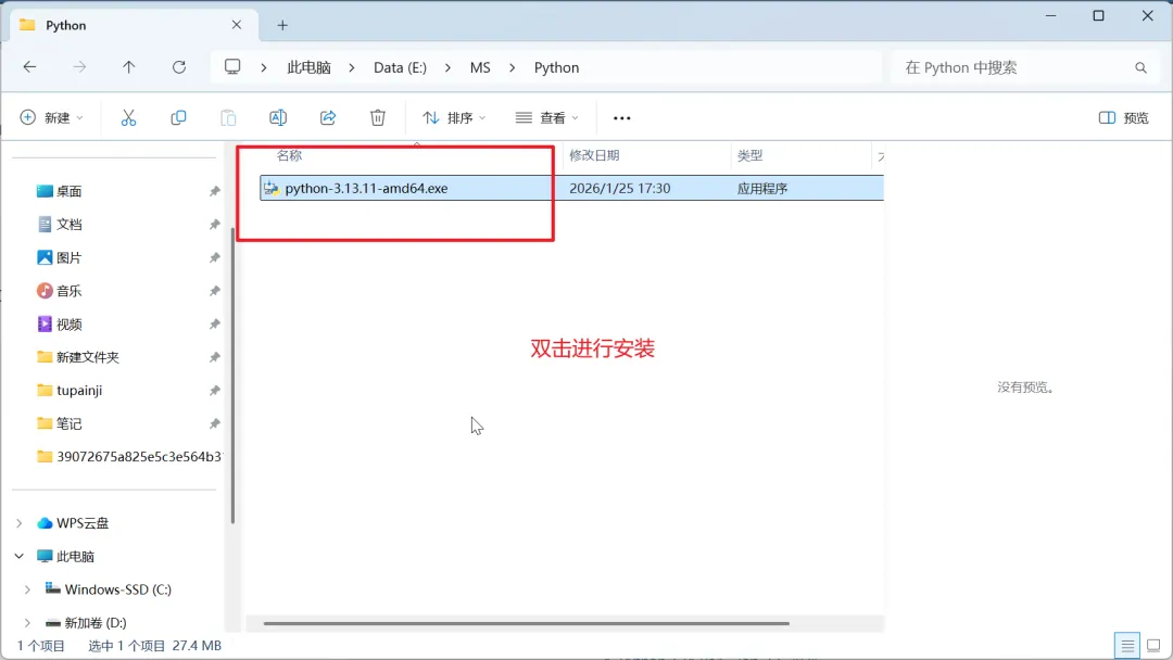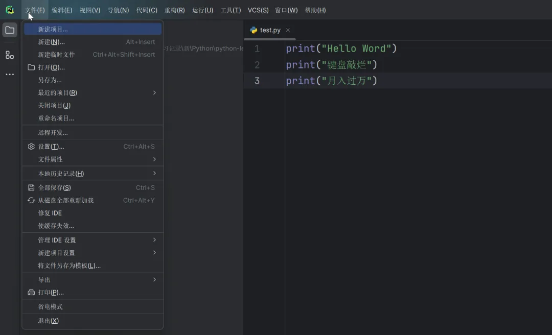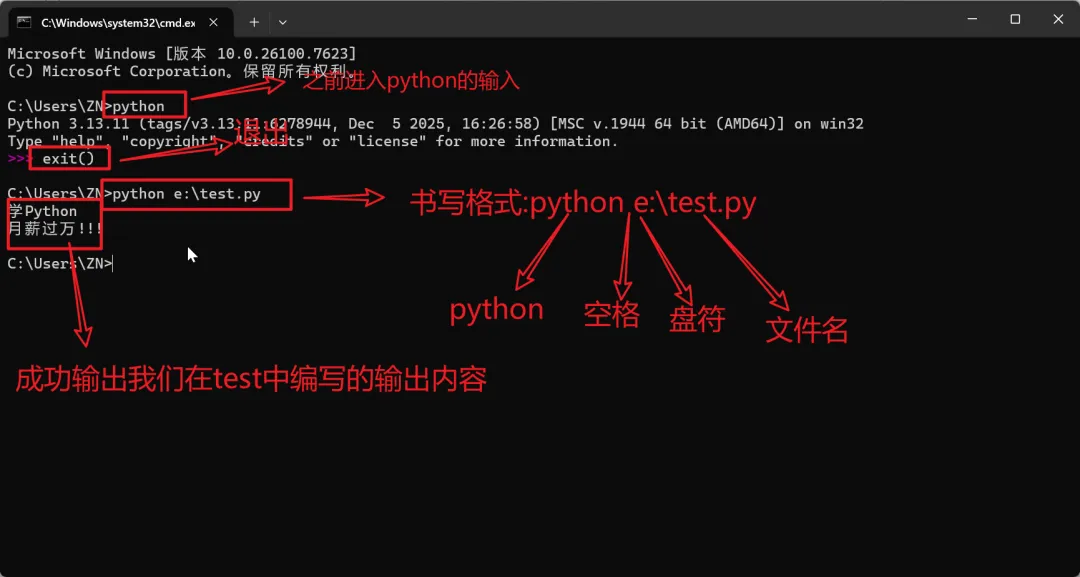 上面我们在验证Python是否安装成功时也实现了一行代码的输出, 那么当我们想要一次性输出多行代码时我们该怎么办呢? 其实非常简单, 我们就用到了Python解释器1、先验证是否安装成功Python解释器, 去你下载Python的文件夹地址中是否能够找到python.exe2、我们在E盘中新建一个名为: test.py的文件, 并通过记事本打开它, 输入如下内容:3、在 "命令提示符" 程序内, 使用python命令, 运行它五、Python开发环境