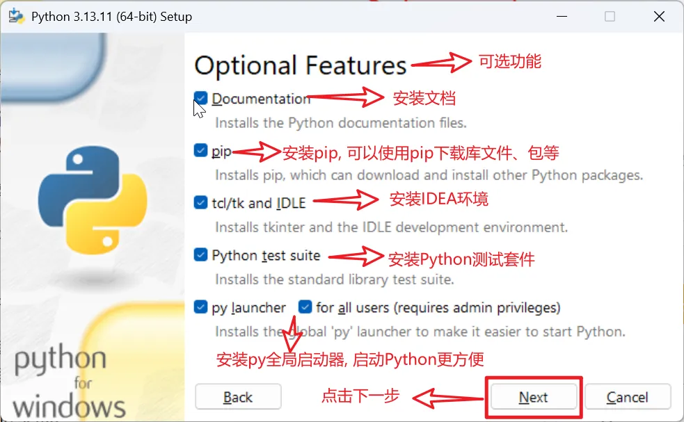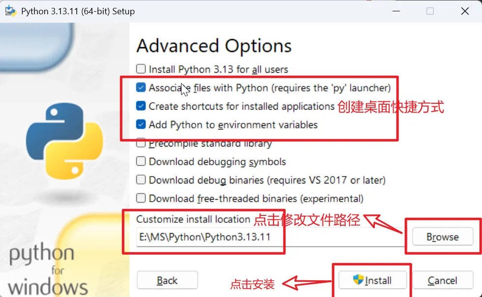 1、下载完成后,找的文件下载的位置,双击就可以运行安装下载完后双击打开Python。2、勾选【Add python.exe to PATH】,点击【Customize installation】进行自定义安装。【Install Now】:立即安装,默认路径 + 默认勾选 Python 基础功能,操作简单但无自定义空间;【Customize installation choose location and features】:自定义安装,可自选安装路径和功能(如 pip),灵活可控;【Use admin privileges when installing py.exe】:安装 py.exe 用管理员权限,避免后续操作权限不足报错,建议勾选;【Add python.exe to PATH】:将 Python 加入系统环境变量,可全局调用 python/pip,必勾选(避免装视觉库出错)。3、所有功能全部默认勾选,单击【Next】下一步。【Associate files with Python】:关联 Python 文件,双击.py 文件可直接运行,建议勾选;【Create shortcuts for installed applications】:创建 Python 程序桌面快捷方式,可选(不影响核心使用);【Add Python to environment variables】:将 Python 加入环境变量,可全局调用python/pip,必勾选。三、测试安装是否成功