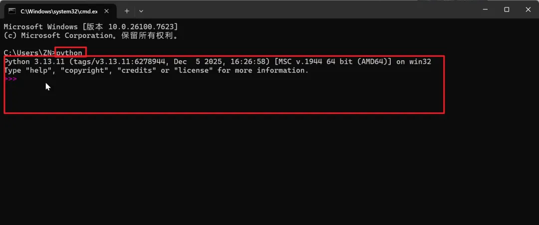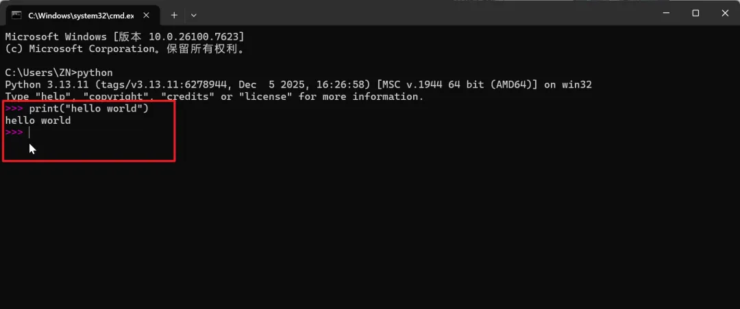 1、Win+R打开运行窗口输入“cmd”,点击【确定】或者回车键2、输入python,返回python的版本信息并进入python环境,当你看到命令提示符“>>>”则代表你已进入Python环境。3、输入代码 print(“hello world”) 点击回车键看是否能运行成功,出现结果hello world则表示代码运行成功。四、Python解释器