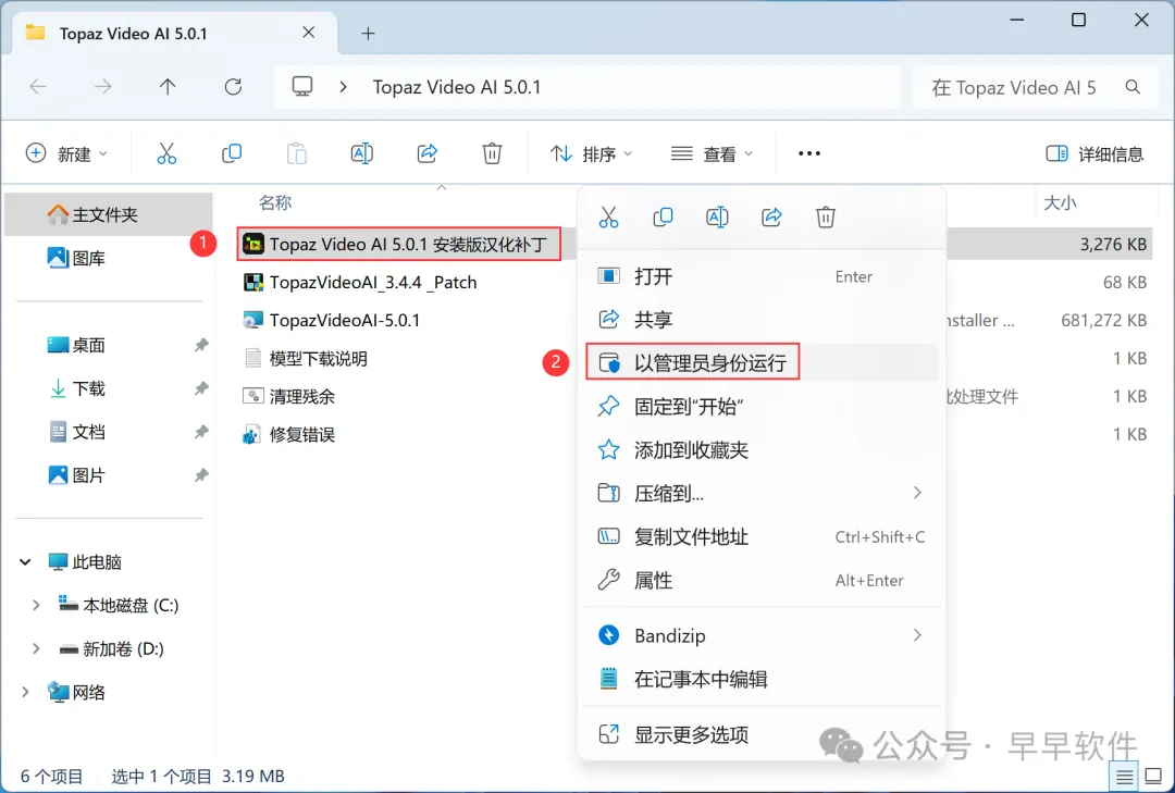 12、回到Topaz Video AI 5.0.1文件夹,找到【Topaz Video AI 5.0.1安装版汉化补丁】应用程序,右键选择【以管理员身份运行】它