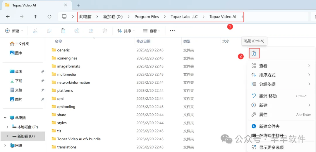 17、打开软件安装路径:D:\Program Files\ Topaz Labs LLC\ Topaz Video AI,步骤6可查看,再右键文件夹的空白处,点击【粘贴按钮】
