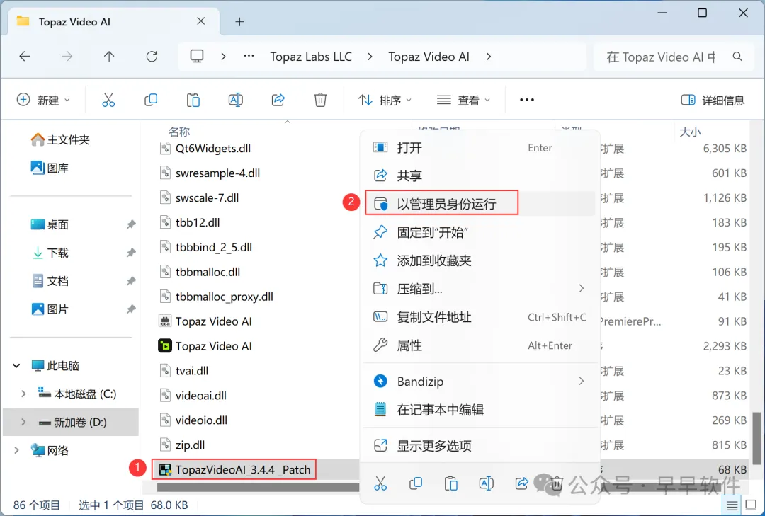 18、找到粘贴的【TopazVideoAI_Patch】文件,再右键选择【以管理员身份运行】它