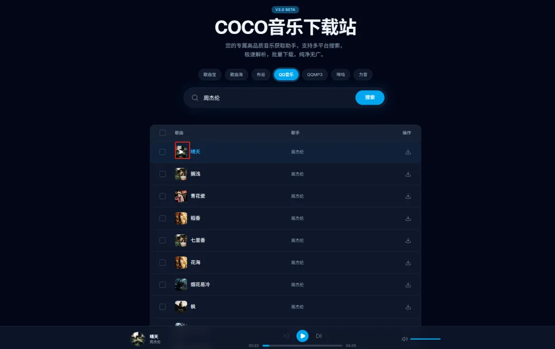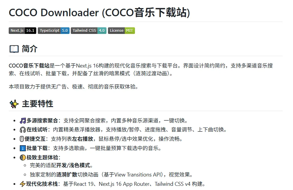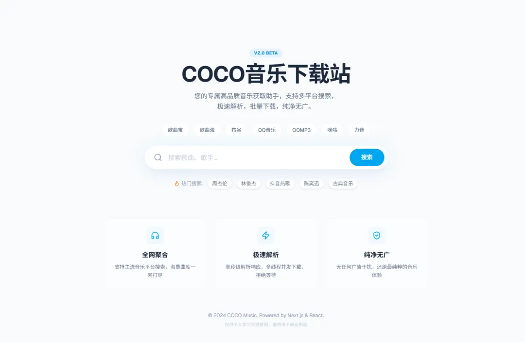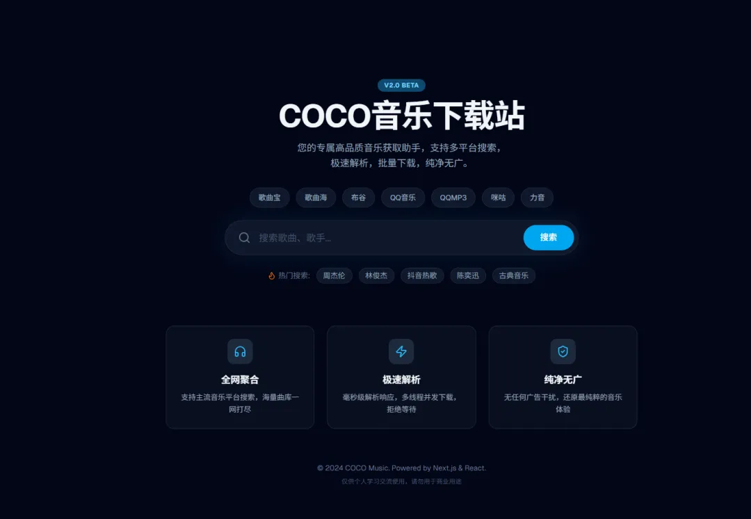 最近给大家分享不少下载音乐资源的项目,本期继续为大家分享一个项目COCO音乐下载站,支持在线听歌以及下载。