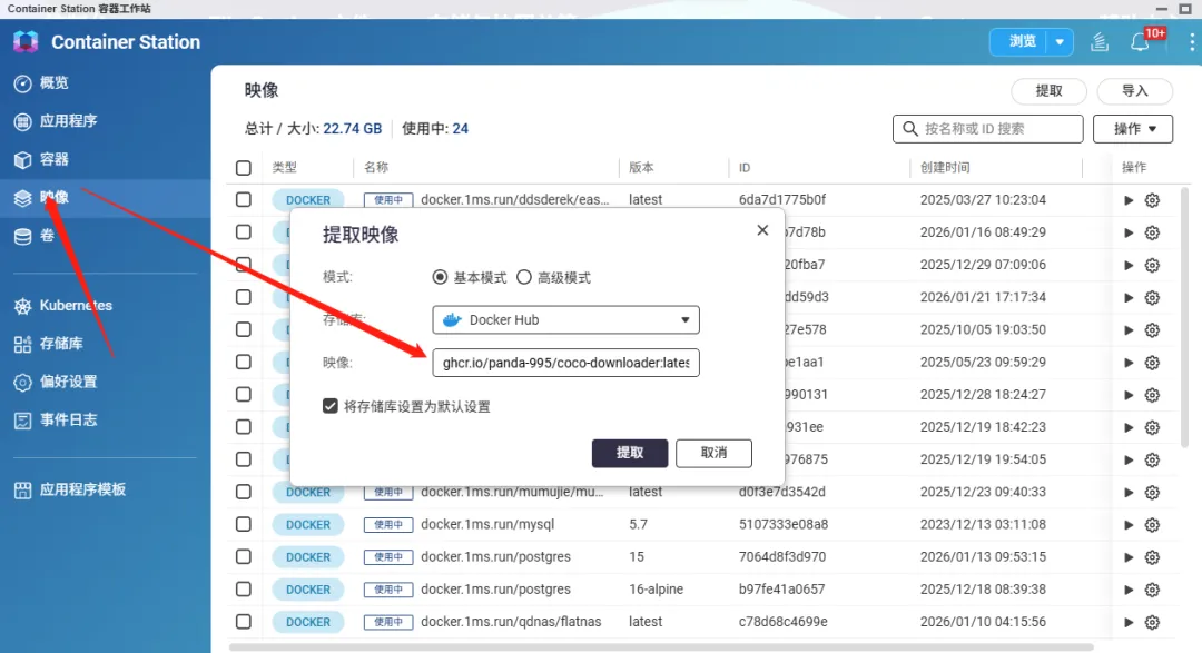 进入NAS后,打开ContainerStation,点击【映像】,输入映像: