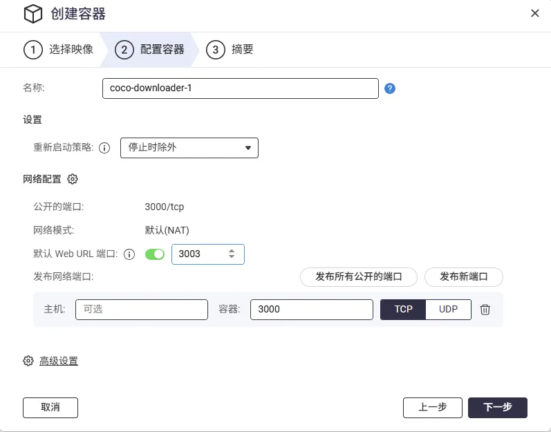 本次使用拉取镜像的方法,只需要设置端口号即可。因为不是直接下载到NAS,通过浏览器下载,不需要设置存储位置。有位NAS玩家在项目基础上优化了下,提供了镜像,我们直接拉取就行。