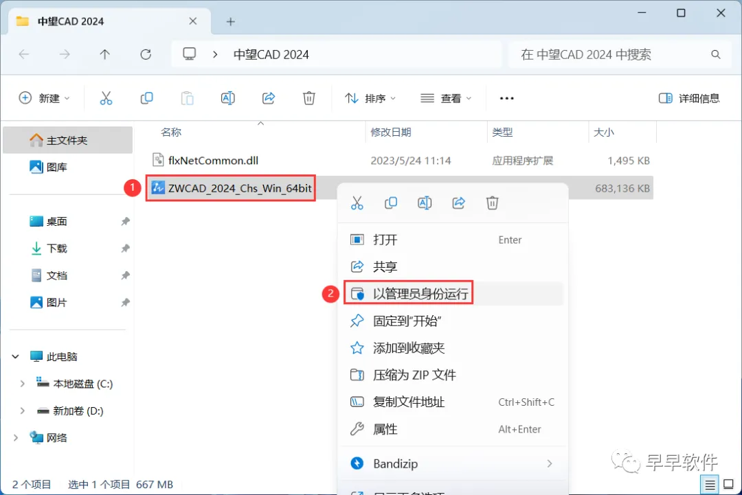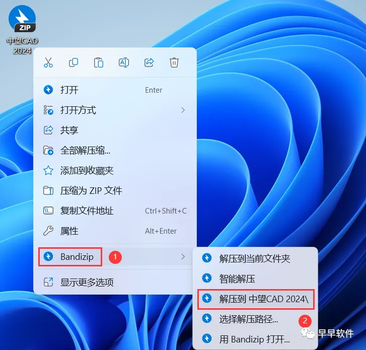 1、下载中望CAD 2024软件安装包到电脑上,右键选择【解压到中望CAD 2024\】