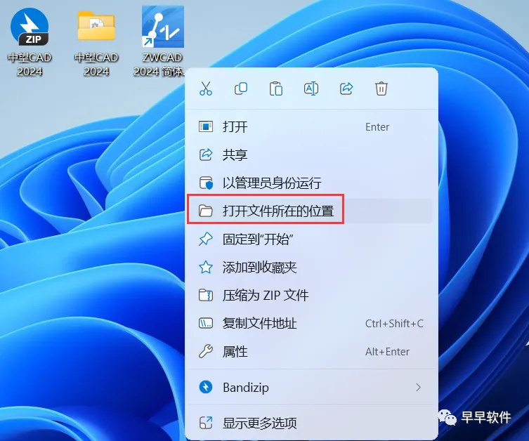 10、回到桌面,右键桌面上的【ZWCAD 2024软件图标】,点击【打开文件所在的位置】