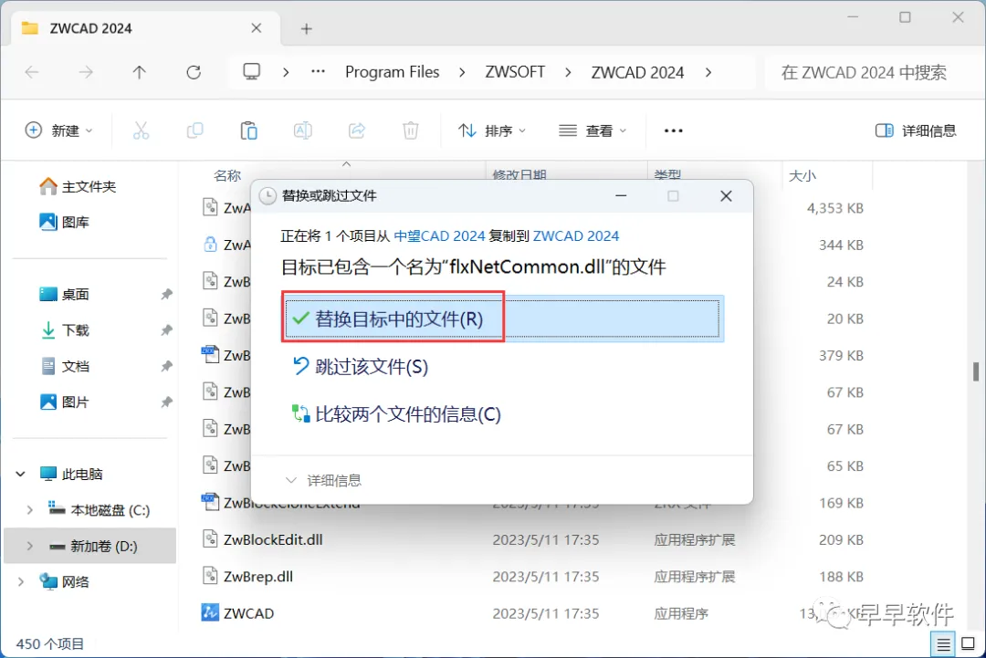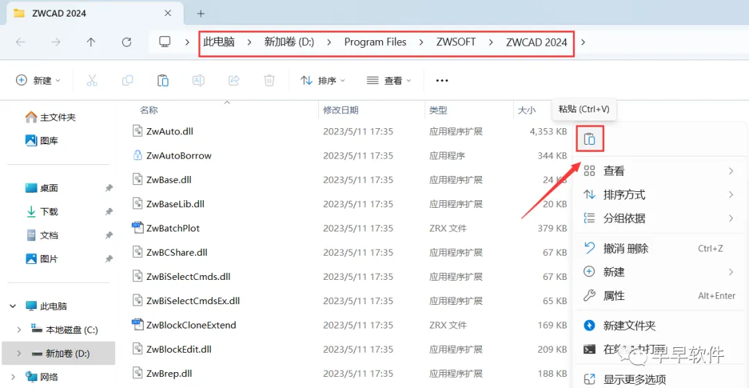 9、回到中望CAD 2024文件夹,找到【flxNetCommon.dll】文件,右键点击【复制按钮】