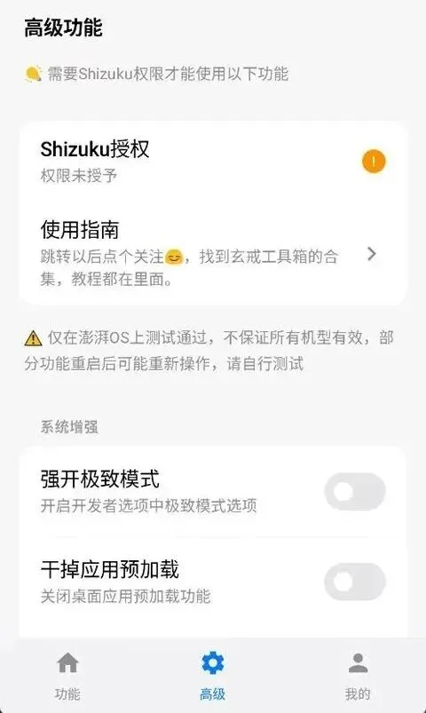 高级功能通过Shizuku框架实现,确保了功能的稳定性和兼容性,同时提升了系统调用的效率。
