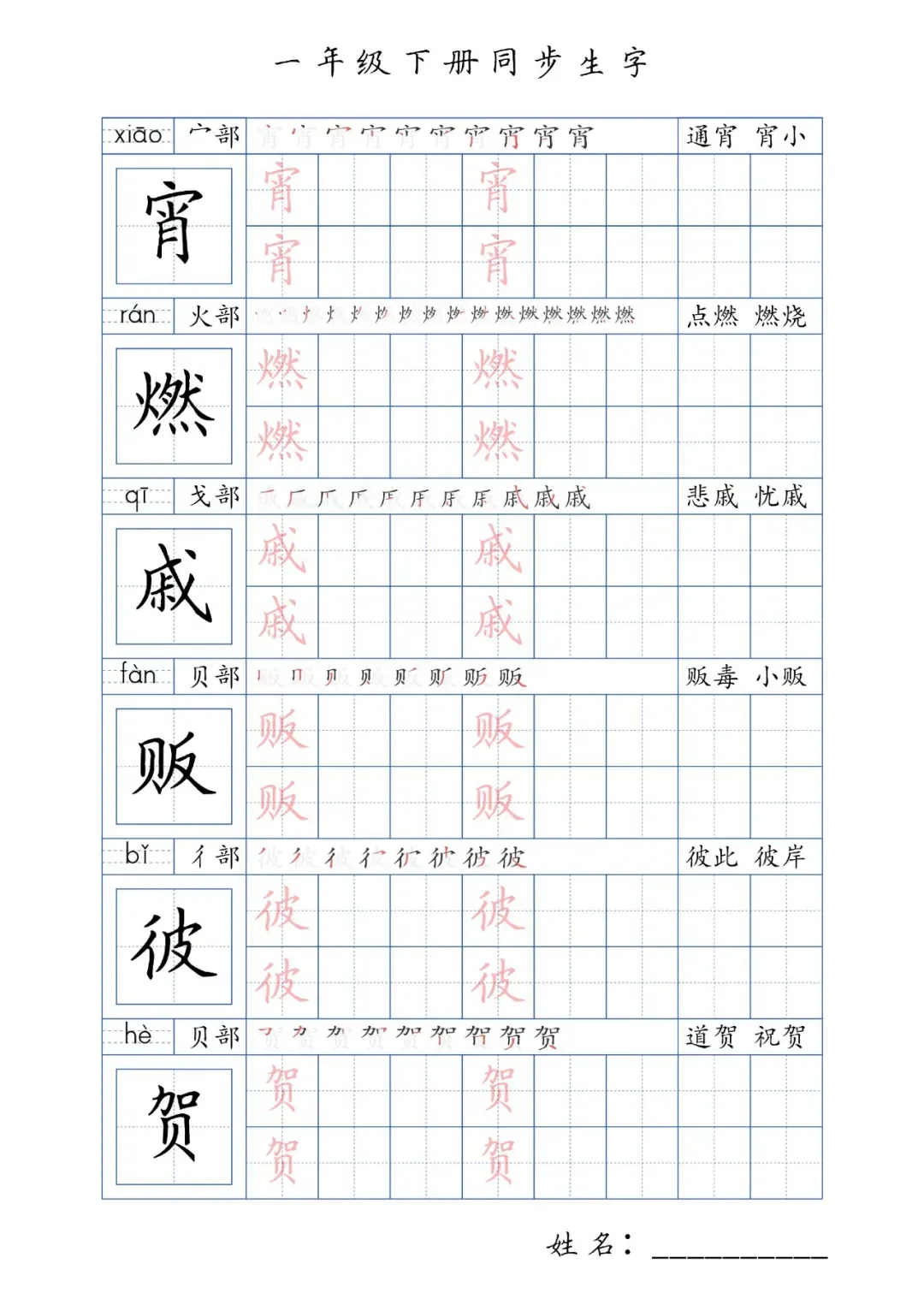 同步生字一年级下册,PDF免费下载